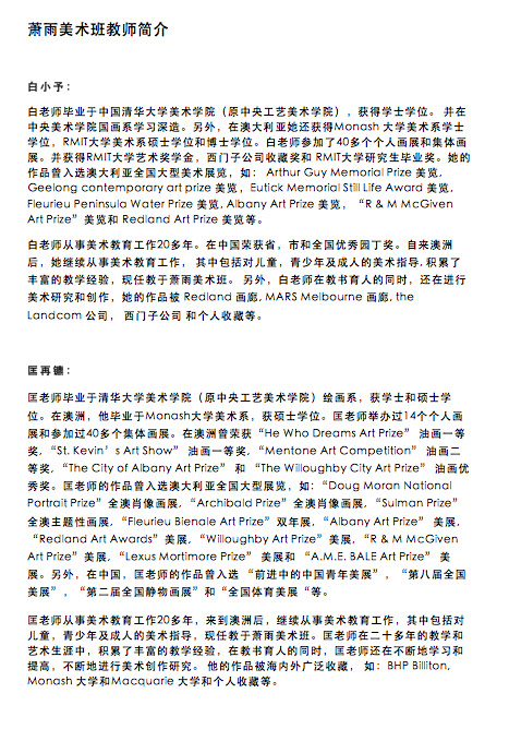 Zai Kuang has had many years of teaching experience in university in China. In Australia, he has continued teaching children, young people and adults. Currently, he is a teacher at Xiao Yu Art Studio. In the fields of teaching and art, he has over 20 years of experience.
